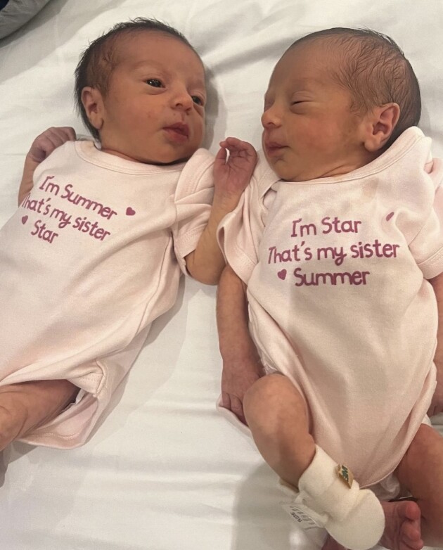 The portrait showcases the twins wearing alternative baby grows. One reads: “I’m Summer, that’s my sister Star,” while the other reads: “I’m Star, that’s my sister Summer”.