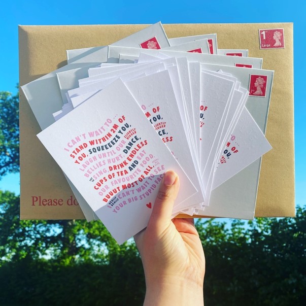 As COVID-19 hit, Louie also launched a range of postcards for people to send to their loved ones. Like most, Becca felt the effects of having to stay indoors during lockdown. With a percentage of the population facing 12 weeks of isolation, Becca decided to offer 50 of her postcards for a 50p donation, which was then given to charity. She also offered to handwrite people’s messages to their loved ones if they were having to isolate and could not get to a postbox. With 150+ postcards completed (not to mention an aching left hand), Becca felt like she’d achieved something truly special.