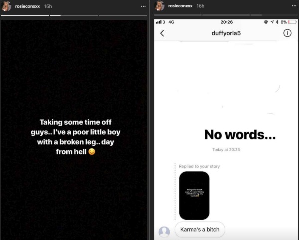 However, soon after the post, Rosie received a response to her story regarding her son's injury – 'Karma's a bitch.'