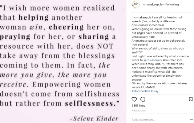 Her action comes after friend and fellow Irish influencer Rosie Connolly received a cruel message from a follower.