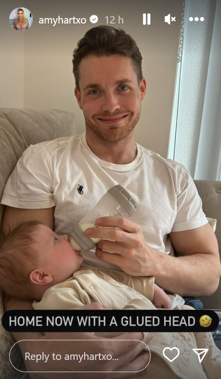Sharing a snap of Sam cradling and feeding their newborn son with a smile on his face, the former reality TV star penned, “Home now with a glued head”, followed by a laughing emoji.