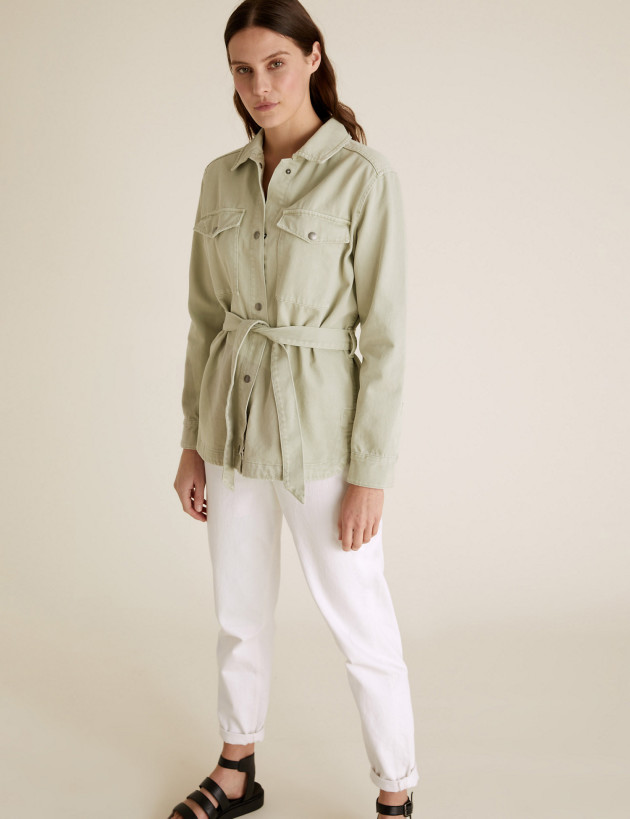 We adore the lovely pale apple hue of this denim utility jacket. Plus, the thick belt really flatters the silhouette.