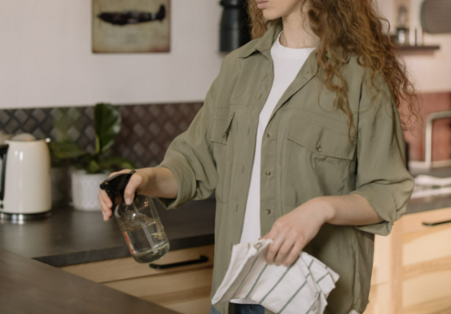 Vinegar can be used to clean surfaces where you prepare and eat food because it is non-toxic and food safe. Mix equal parts water to white vinegar and spray on all of your kitchen work surfaces, dining tables and coffee tables. Vinegar helps to remove grease as well, so try it on your hob to make it look brand new again.
