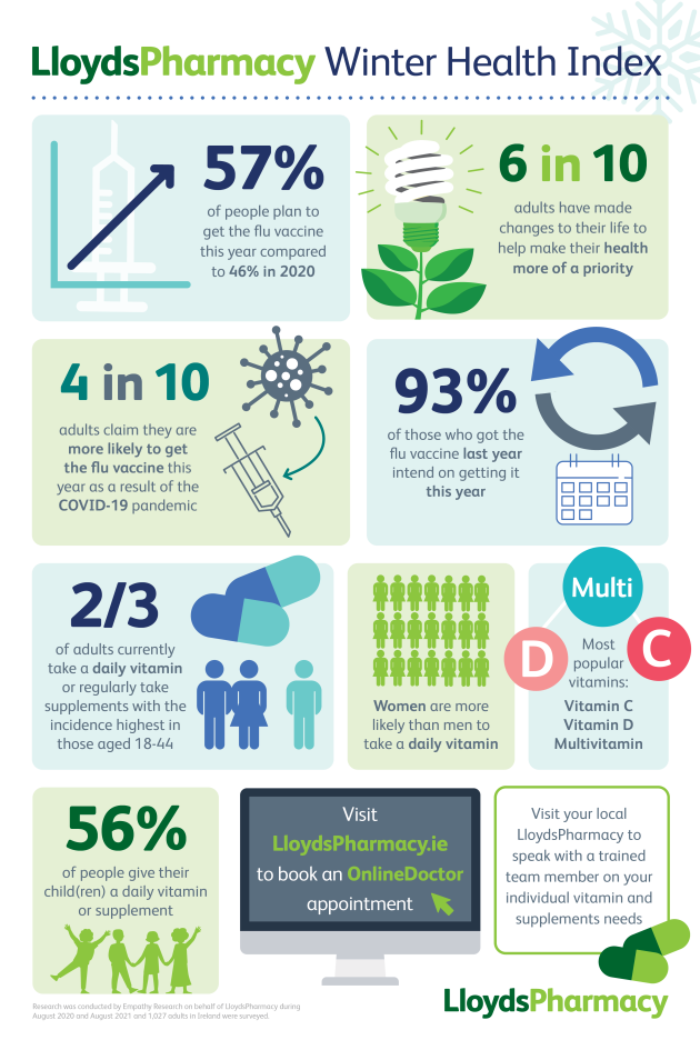 Denis O’Driscoll, LloydsPharmacy Superintendent pharmacist said “COVID-19 has really brought our individual and collective health into focus for people. Across our pharmacies we saw trends such as an increase in vitamin sales and more people booking flu vaccinations that showed that to be true. LloydsPharmacy have launched our first winter health index so we can track the behaviours and attitudes of people in Ireland to their health. As COVID-19 continues to circulate in communities around Ireland and people go back to school, college and offices it’s crucial that people make their health a priority this winter by booking a flu vaccination in their local LloydsPharmacy and discussing their vitamins and supplements needs with the team in-store. Last year’s flu vaccination uptake increase of 50% was encouraging to see and our health index indicates those numbers could be higher this year. In order for the vaccine to be as effective as possible, as many of the population as possible need to get vaccinated. LloydsPharmacy’s highly trained colleagues are always on hand to support their communities and all COVID-19 precautions are in place in our participating pharmacies nationwide making it a safe environment to get your flu vaccination.”