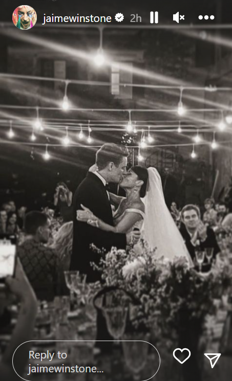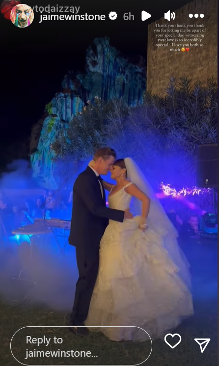 One video shows the bride and groom dancing together while being surrounded by strobe lights, another clip depicts Jaime and her bridesmaids singing The Dixie Cups’ song Going To The Chapel, while more footage shows Jaime and James sharing a kiss in front of a sea of wedding guests.