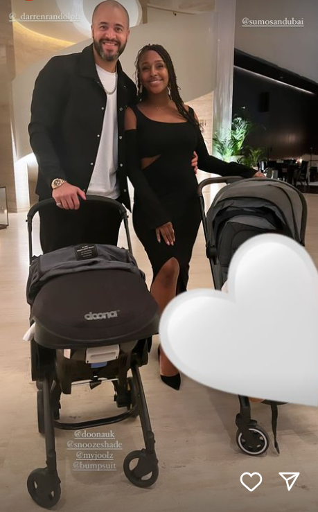 A heartwarming photo shows the tot’s footprints in the sand, before Alexandra added another picture of her and Darren posing with their children sat in their buggies.