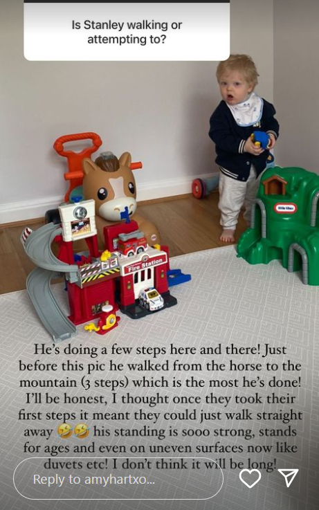 While answering a Q&A about herself and her family on her Instagram Stories from some of her 1M followers, Amy was asked, “Is Stanley walking or attempting to?”.