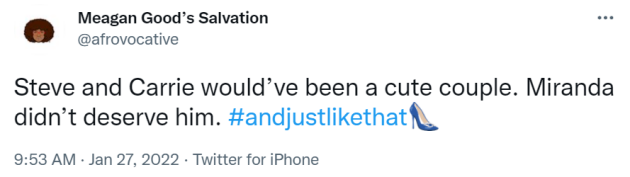 “Steve and Carrie would’ve been a cute couple. Miranda didn’t deserve him. #andjustlikethat,” another fan tweet read.