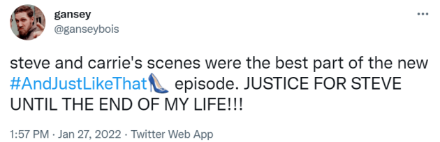 “Steve and Carrie's scenes were the best part of the new #AndJustLikeThat episode. JUSTICE FOR STEVE UNTIL THE END OF MY LIFE!!!” another tweeted.
