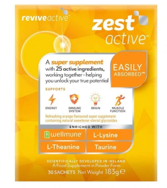 There are 8 Immunity Supporting Ingredients in Revive Active, Zest Active, Junior & Teen Revive: Vitamins B6, B12, C, & D, Zinc, Copper, Folate and Selenium. These all contribute to the normal function of the Immune System.