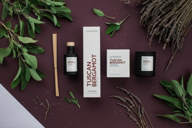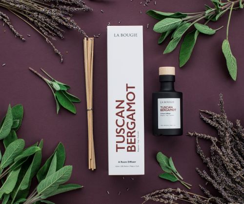 La Bougie take an expert blend of herbs and fruit including sage, thyme, lavender, mint, and bergamot to create a layered, romantic, and Tuscan-inspired fragrance available in candle, diffuser, room spray and a delightful Eau De Parfum.