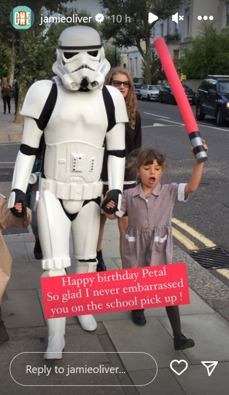 Another photo shows Jamie dressed as a Stormtrooper as he brought Petal home from school. He penned, “So glad I never embarrassed you on the school pick up!”.