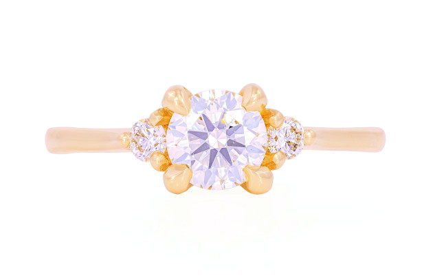 The Ring: A diamond solitaire is flanked by two tiny classic diamonds, atop one of Chupi’s signature polished ring bands available with either diamonds or lab-grown diamonds.