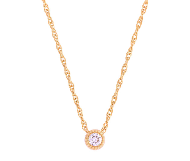 The Necklace: A bezel set diamond solitaire necklace sits on one a fine 14k gold chain.