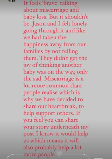 Laura then posted a message on her Instagram stories telling her followers that "miscarriage is a lot more common than people realise", and asked people to share their own stories if they wished as it would "help us which means it will also probably help a lot more people".