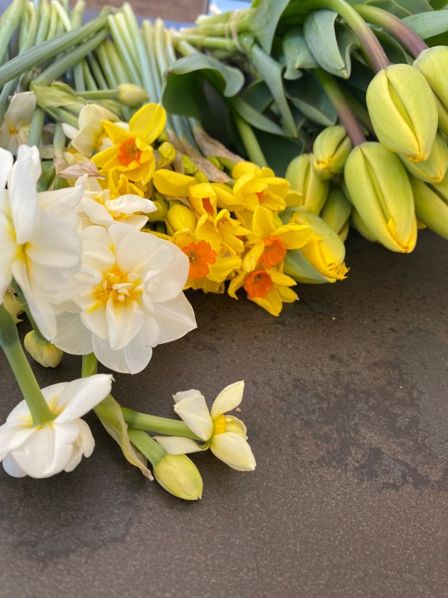 Choose the freshest blooms. Do not choose flowers that have brownish marks or look bruised. Tulips and daffodils will open more in a warm room.
