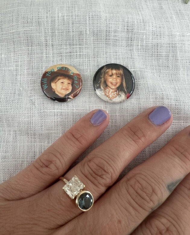 Then, the second image gives fans a better look at the gorgeous piece of jewellery – a circular emerald stud, sitting beside a glistening diamond square. The cute photo also teases how Jack chose to propose to Emily, with childhood pictures of the couple printed onto badges, alongside the words ‘Will you marry me? Yes!’