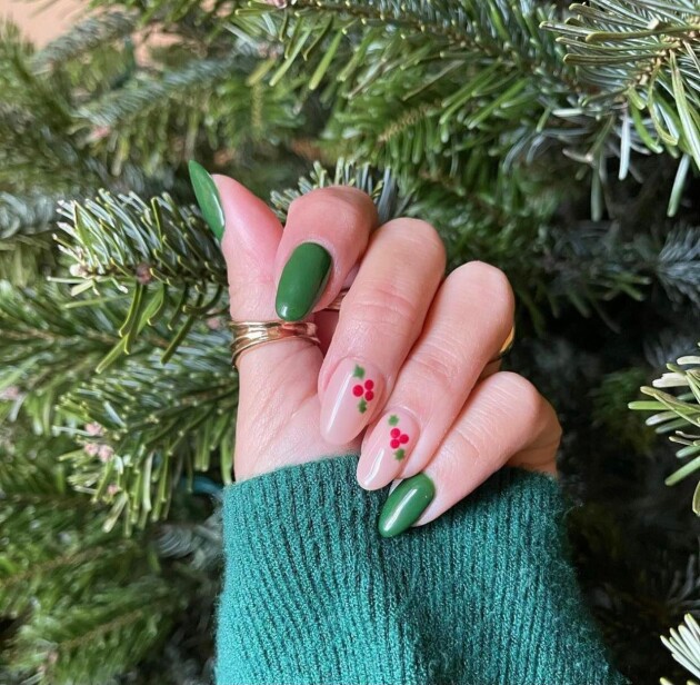 Red, white and gold are obvious nail polish colours to go for at this time of year, so why not mix things up a bit and go for this fabulous forest green colour? The neutral accent nails with boughs of holly are such a pretty touch.