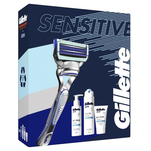 This set includes a SkinGuard Razor and Shave Gel, a Gillette SKIN Moisturiser and Gillette SKIN Facewash. It's the perfect gift for anyone with sensitive skin. The unique SkinGuard positioned between the blades absorbs pressure, flattens the skin, and raises the blades to cut hair at skin level, helping to prevent irritation. The optimally spaced blades also minimize tug and pull, and the SkinGuard Sensitive razor is clinically proven for sensitive skin while giving you the reliable shave you expect from a Gillette razor.