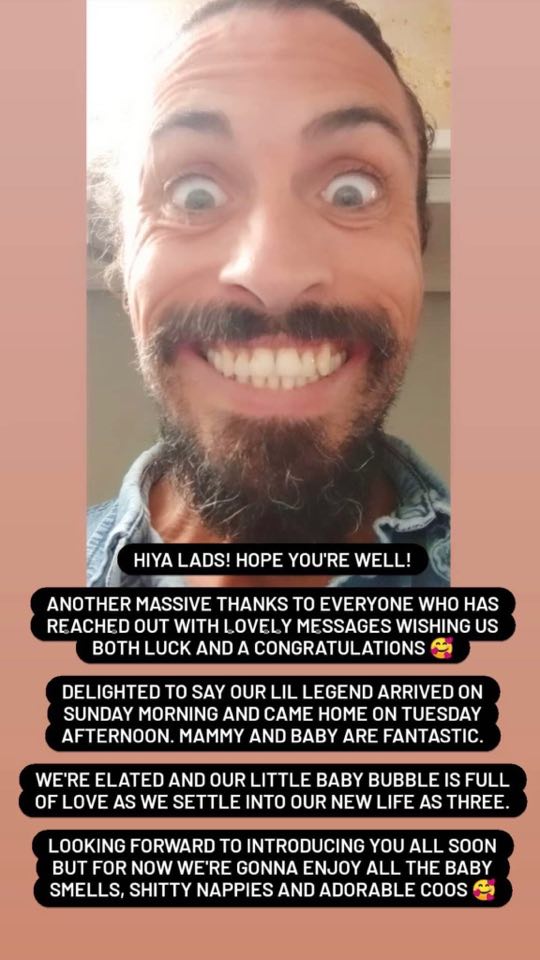 "Delighted to say our lil legend arrived on Sunday morning and came home on Tuesday afternoon," the new dad revealed, adding, "Mammy and baby are fantastic."