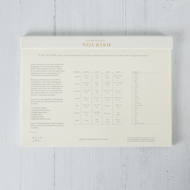 When is the last time you really sat down and thought about how you are nourishing your body? Do you grab food and eat on the go? Do you walk aimlessly around the supermarket picking up food as you frantically plan your meals with little thought? Allow us to introduce you to Nourish by The Head Plan. This weekly planning pad is everything you need to get you on top of your nourishment needs as you mindfully plan your breakfast, lunch, dinner and snacks for the week. You're covered with the removable shopping list so you'll never miss that item in the supermarket again.