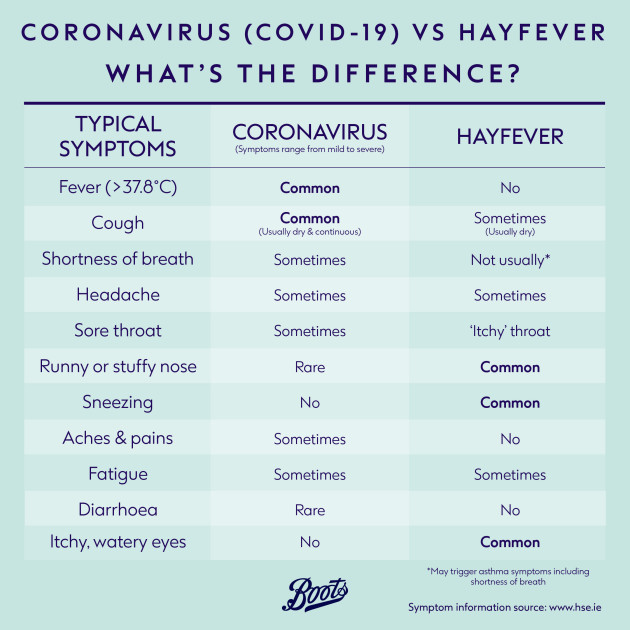 “Hayfever symptoms are different to Coronavirus. The most common symptoms of Coronavirus are a high temperature and / or a new continuous cough. Hayfever doesn’t cause a high temperature and most people don’t feel unwell. While our knowledge of Coronavirus is still evolving it appears that sneezing is not a symptom and it's rare to have a runny or stuffy nose.