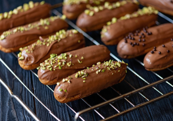 Spread the chocolate ganache over each éclair and leave to set.