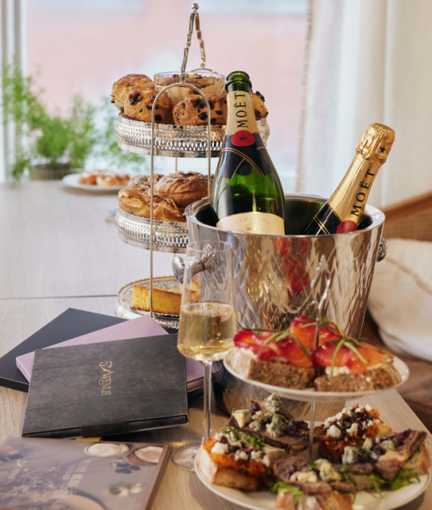 A decadent selection of luxury savoury and dessert canapes such as beetroot cured salmon with avocado, grilled prawns and nduja, and panna cotta with coconut-dusted mango are available to pre-order courtesy of On My Plate, complimented with a bottle of Champagne.