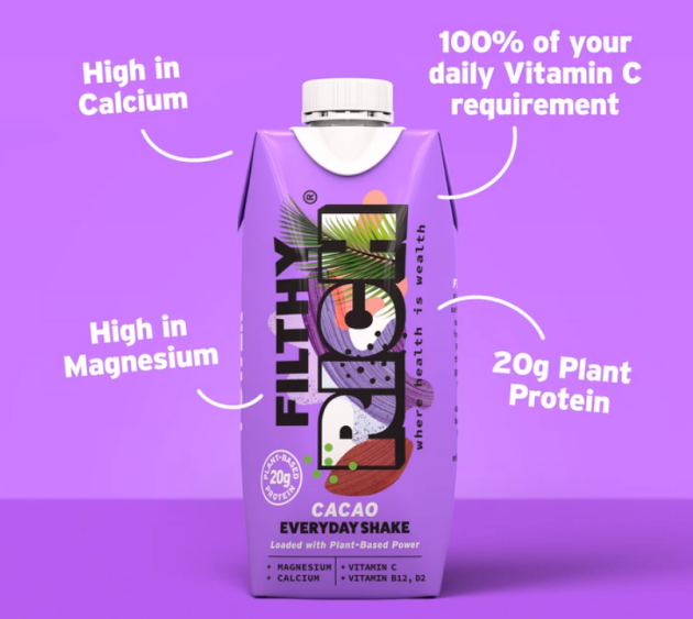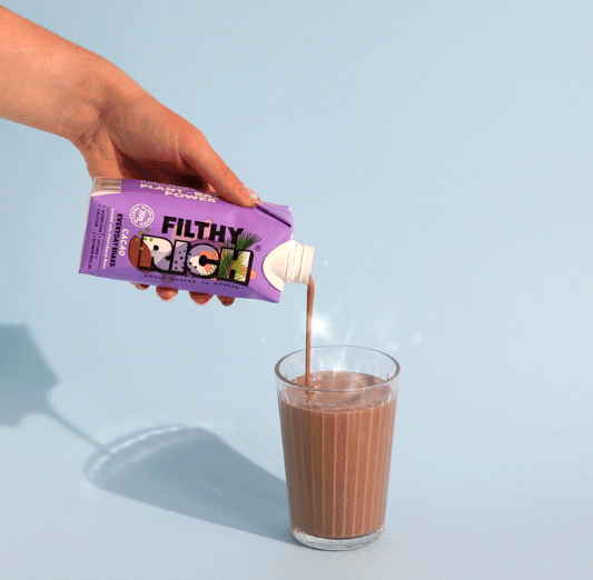Filthy Rich shakes are dairy-free, gluten-free, soy-free and low in sugar. Each 330ml recyclable carton comes loaded with 20g of vegan pea protein, 100% of your recommended daily allowance of Vitamin C, and 30% of your recommended daily magnesium and calcium.