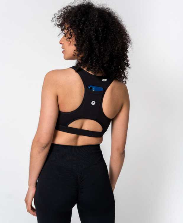 Finally, you’ll no longer need to wear an armband phone holder while running! The sports bra also has a double fabric front panel, is chafe resistant and is moisture wicking.