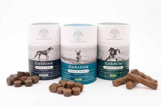 Developed by a team of marine scientists, Blue Pet Co.’s tasty chewable supplements GoShine, GoActive and GoSmile target critical areas of health concern in dogs – joints and muscles, skin and hair, teeth and gums.
