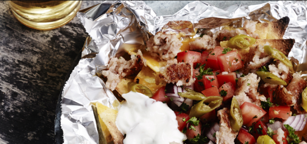 Layer the nacho chips and grated cheese on a tin foil covered tray, heat in a moderate oven (180ºC) for 5 minutes until the cheese is melted.