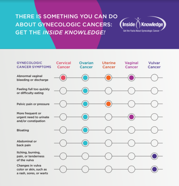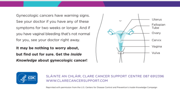 “Knowing the symptoms of the gynaecological cancers can help with early diagnosis. We encourage women to become familiar with the “Inside Knowledge” leaflet below which highlights the symptoms associated with each gynaecological cancer. Please contact your GP if you have symptoms that persist for more than 2 weeks.”