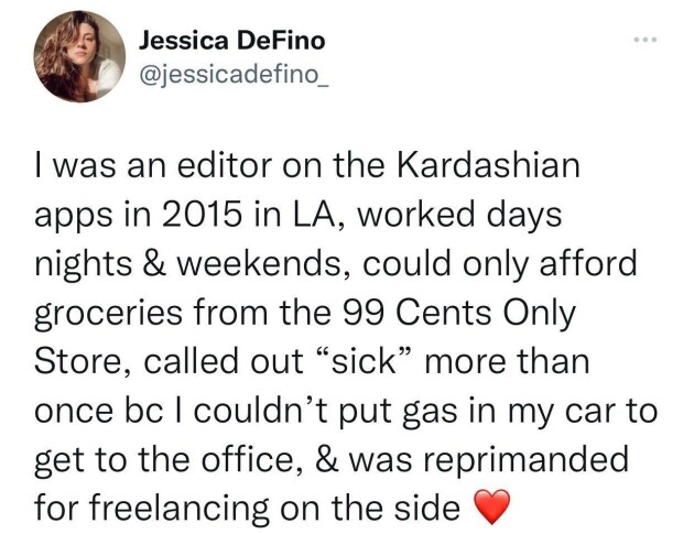 A women named Jessica DeFino claims to have previously worked for the Kardashians several years ago, describing less than ideal working conditions, as she Tweeted, “I was an editor on the Kardashian apps in 2015 in LA, worked days, nights & weekends, could only afford groceries from the 99 Cents Only Store."