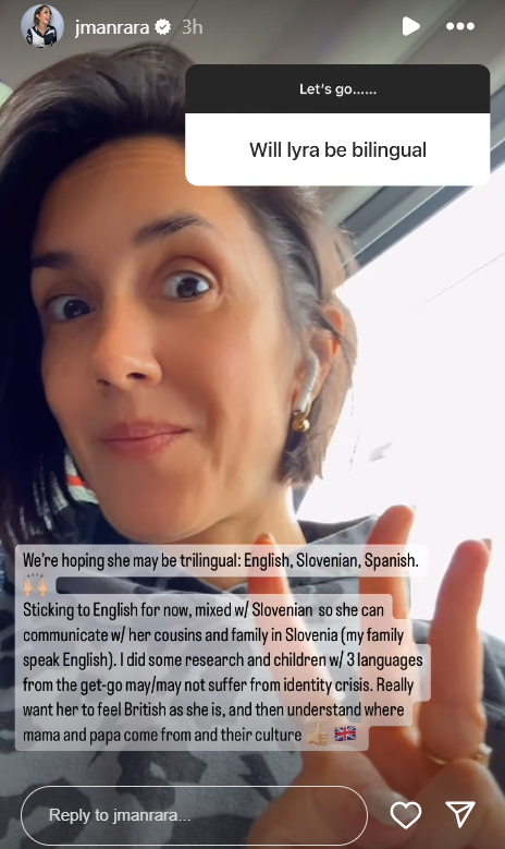 The 40-year-old revealed she and Aljaž are hoping she will be trilingual as she explained, “We’re hoping she may be trilingual: English, Slovenian, Spanish. Sticking to English for now, mixed w/ Slovenian so she can communicate w/ her cousins and family in Slovenia (my family speak English)”.