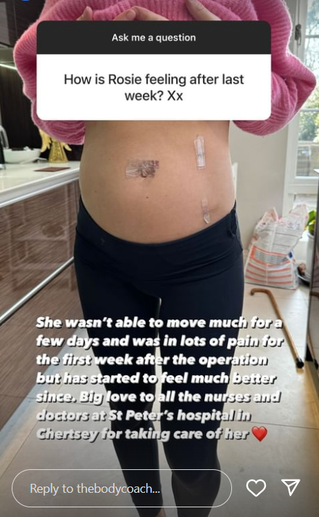 Joe posted a photo of Rosie’s blossoming baby bump to his Stories. In the picture, Rosie’s stitches can be seen on display around her belly button and on the side of her stomach.