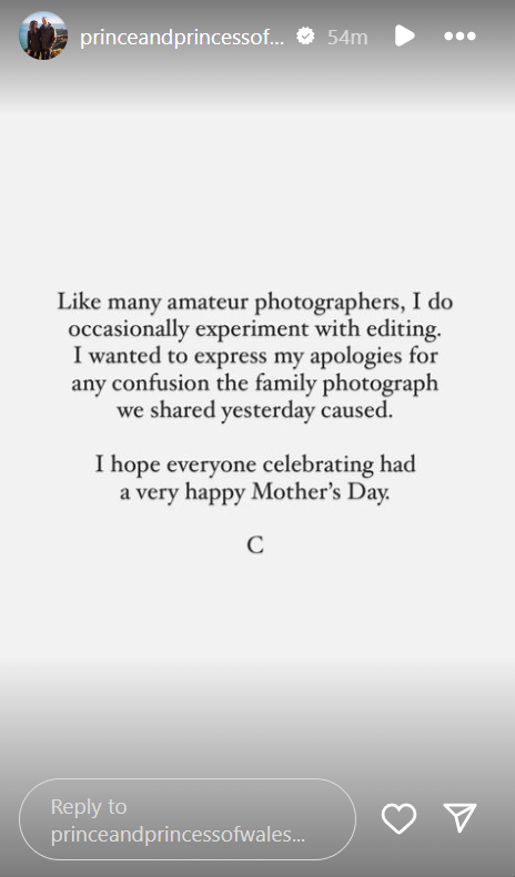 “I wanted to express my apologies for any confusion the family photograph we shared yesterday caused”.