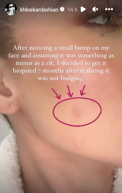 Posting a photo of her cheek, the Keeping Up With the Kardashians star penned, “After noticing a small bump on my face and assuming it was something as minor as a zit, I decided to get it biopsied 7 months after realising it was not budging”.