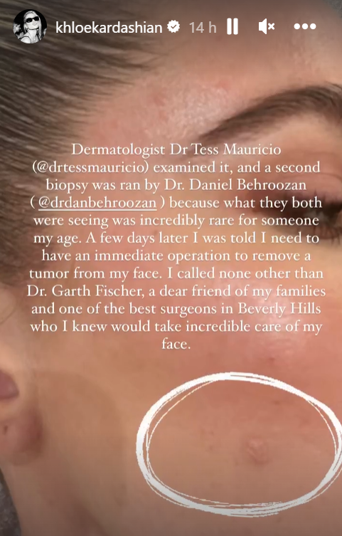 Khloe’s dermatologist ran another biopsy on the sample with a second doctor, and found that “what they were both seeing was incredibly rare for someone my age. A few days later I was told I need to have an immediate operation to remove a tumour from my face”.