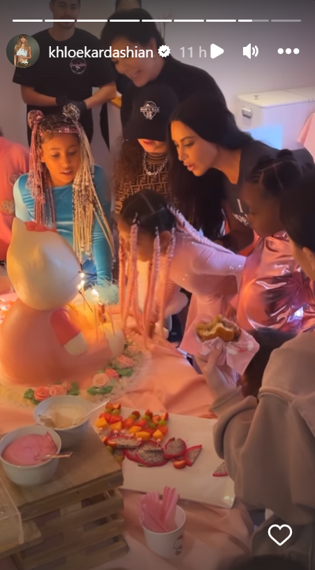 Khloe Kardahsian shared a sweet video of the party-goers singing Happy Birthday to Chicago as she blew out the candles on her cat cake. Kim could be seen helping to hold her daughter’s hair away from the flames as Chi’s nan, Kris Jenner, joined in on the sing-song in the background.