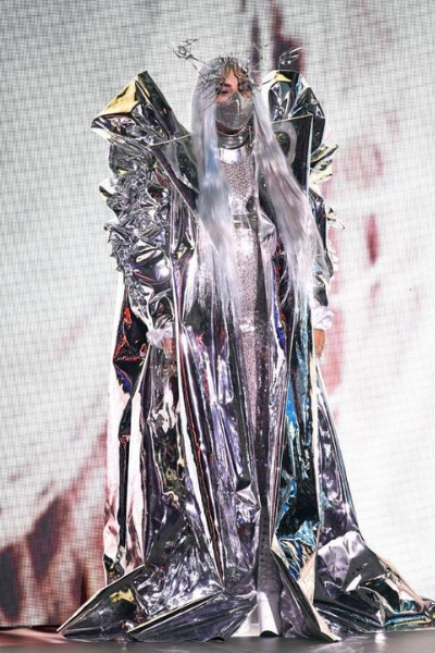 Lucky for us, the pop star had numerous costume changes throughout the night, showcasing a different face covering each time. Gaga started off the night by walking the red carpet wearing an amazing, clear space helmet, to match her metallic silver dress, which she paired with black platform boots.