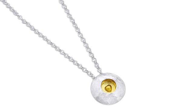 This very personal collection's contemporary pendant combines a textured domed silver disc with a safely sheltered 18 carat gold vermeil heart. Sterling silver and 18 carat gold vermeil on a sterling silver belcher chain, this award-winning jewellery is unique, contemporary and sculpted using traditional skills. Garrett Mallon's master craftsman skills along with his signature style of combining metals and textures have created an audience for his work throughout Ireland and the rest of the world. Irish heritage, culture, mysticism, mythology, nature and beauty are all captured in Garrett’s unique pieces. Whether it is the beauty of an Irish summer’s day or the passion and fire of the Celtic race, Ireland continues to provide Garrett with inspiration for his stunning Irish made Jewellery. Available to buy here.
