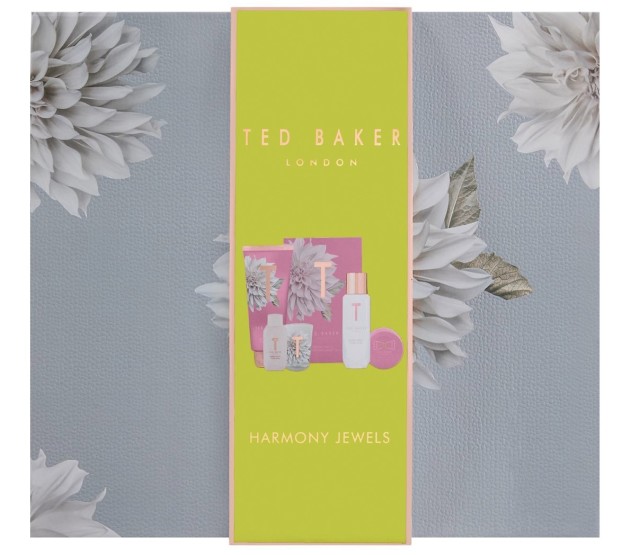 Bestow a present of regal proportions with Harmony Jewels. Packed with bath-time treats including Peony Spritz Body Wash, Body Souffle and a moisturising sheet mask. Complete with a bespoke Ted Baker Floral Bliss candle, Body Spray and Bubble bath blended with juicy notes of green apple and delicate water lily florals with a touch of sandalwood for a delicious finish.