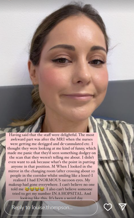 Sharing photos of herself at the hospital to her 1.5M Instagram followers on her Stories, including a photo of an MRI form, Louise admitted, “Everything about this was horrendous”, before explaining her experience with getting the scan done.