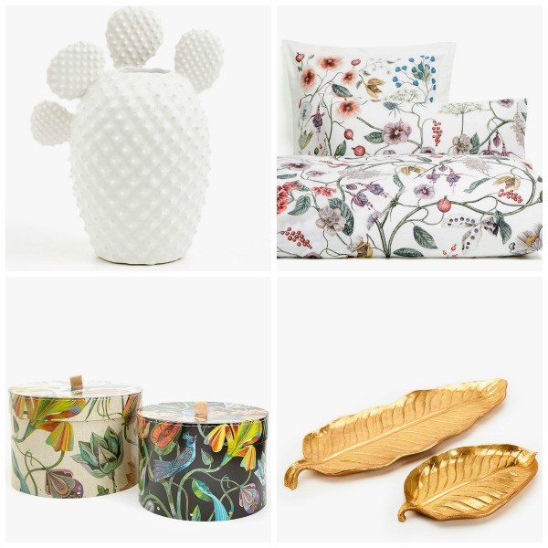Cactus vase €35.99, Floral bedding €59.99, Storage boxes €11.99, Leaf jewellery plates €22.99