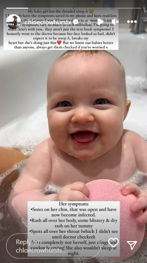 Crowhurst posted a video of her little one in the bath to her Instagram Stories and explained, “My baby girl has the dreaded strep A. I honestly have the symptoms saved in my phone and have read lots of info on this because I was SO worried like most mummy’s are”.