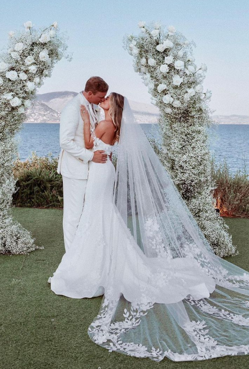 Zara’s husband looked dapper in a white suit as the couple kissed in front of a flower arch set up near the Greek seaside.