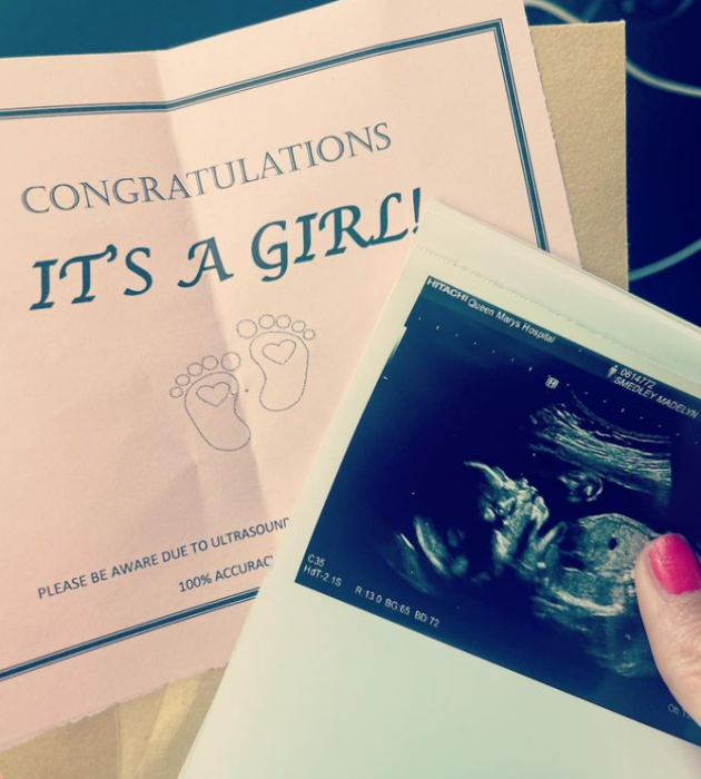 Maddy shared a snap of her baby’s scan alongside a card that reads, ‘Congratulations. It’s a Girl!’, to social media.