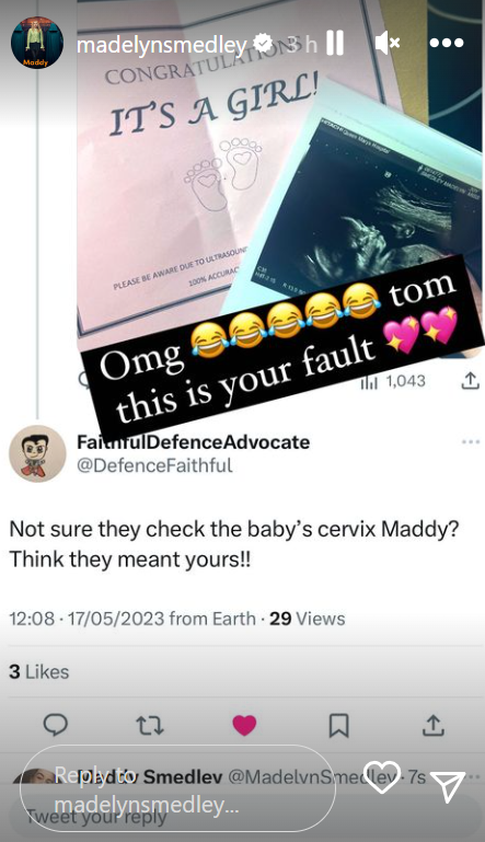 “Not sure they check the baby’s cervix Maddy? Think they meant yours!”, penned another fan, to which Maddy replied, “Shut the front door. Blaming Tom for this”.