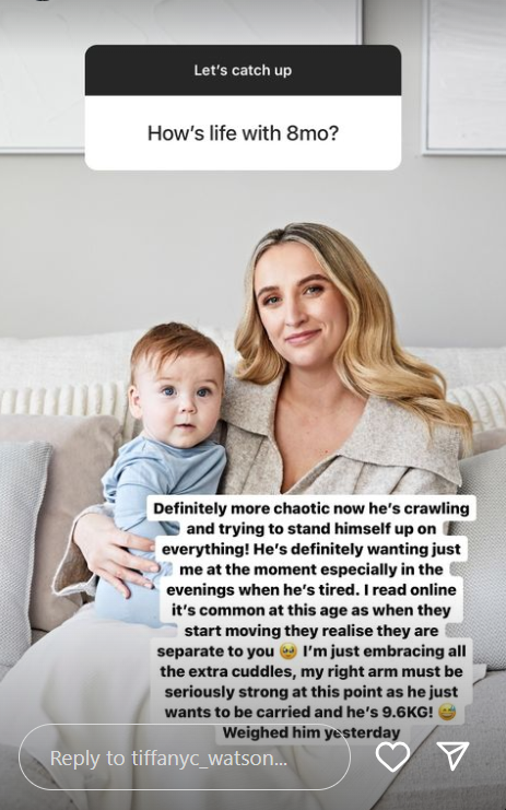 One fan asked, ‘How’s life with 8mo?’, to which the former reality TV star responded to by explaining, “Definitely more chaotic now he’s crawling and trying to stand himself up on everything!”.